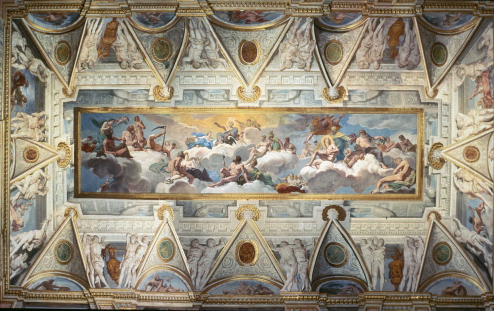 La sala in origine si presentava come una loggia aperta verso i giardini segreti, nella seconda metà del Settecento però, l'ambiente venne chiuso per garantire la conservazione della volta con il Concilio degli Dei, dipinta tra il 1624 e il 1625 da Giovanni Lanfranco (1582-1647).