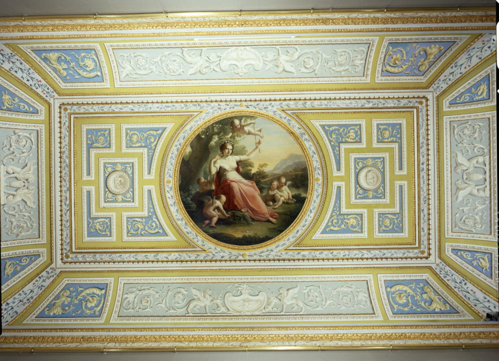 The room takes its name from the subject depicted in the middle of the ceiling, executed in 1785 by Domenico De Angelis (1735–1804). Here Flora is represented as the mother of plants and flowers according to the iconography of Ovid’s Fasti..The trompe-oeil elements and vegetal volutes, instead, were painted by Giovan Battista Marchetti (1730–1800).