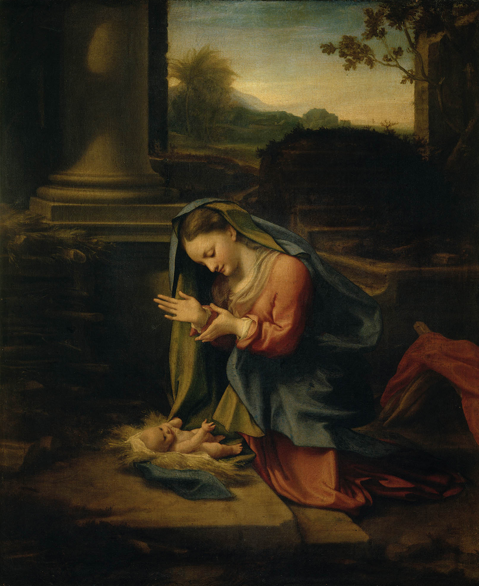 Alle opere di soggetto mitologico saranno affiancati circa venti capolavori raffiguranti temi religiosi, dove il rapporto tra Correggio e l’antico è allo stesso modo significativo per scelte formali e compositive. Come il Noli me tangere dal Prado, la Madonna del latte da Budapest, Quattro Santi dal Metropolitan, l’Adorazione dei Magi dalla Pinacoteca di Brera, Matrimonio mistico di Santa Caterina da Capodimonte e la Madonna Campori dalla Galleria Estense di Modena. Opere dalla quali emerge il Correggio pittore degli affetti, della grazia, del colore, della morbidezza e della luce. Viene spesso indicato come il pittore delle difficoltà e dell’indipingibile perché nessuno meglio di lui seppe raffigurare l’aria, i vapori, le nebbie e tutto ciò che è impalpabile e inafferrabile. E’ per accompagnare il visitatore in questo percorso ideale che la mostra romana è concepita ponendo a confronto i dipinti di Correggio con la scultura classica, ad evidenziare le sue fonti ideali; mentre lo svolgersi cronologico delle sue opere permetterà di seguire il mutamento stilistico e l’ampiezza di respiro che il contatto con Roma portò nella sua concezione. Dai temi mitologici ai capolavori raffiguranti soggetti religiosi la mostra della Galleria rappresenta la monografica più completa mai fatta su Correggio, con la sola eccezione delle inamovibili grandi pale d’altare e delle cupole.